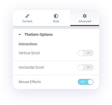 This interaction animates your content in the horizontal directions while scrolling the page. Like in the vertical scroll you can specify different moving directions and speed. All TheGem interactions can be separately defined for desktops, tablets and mobiles.